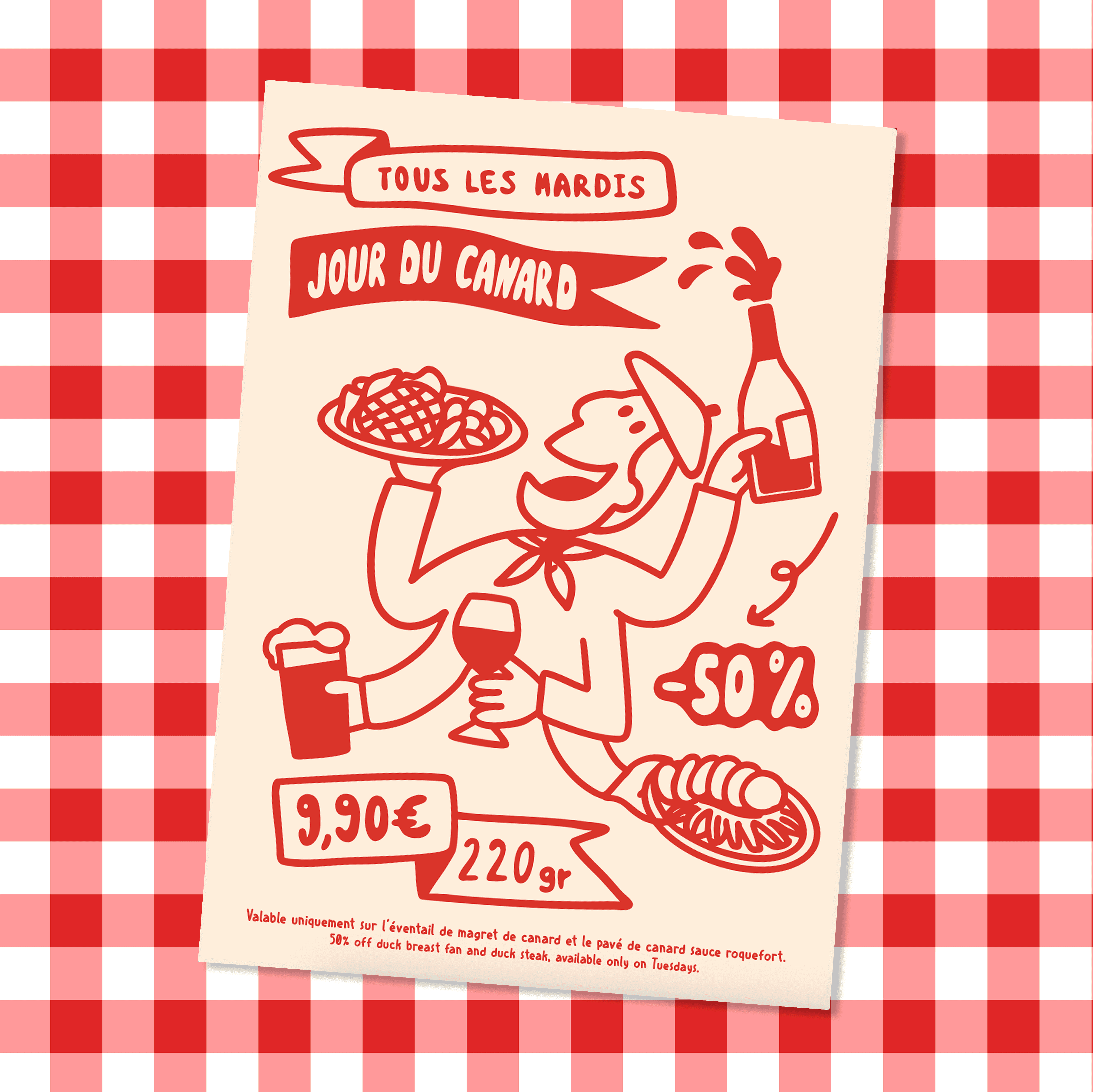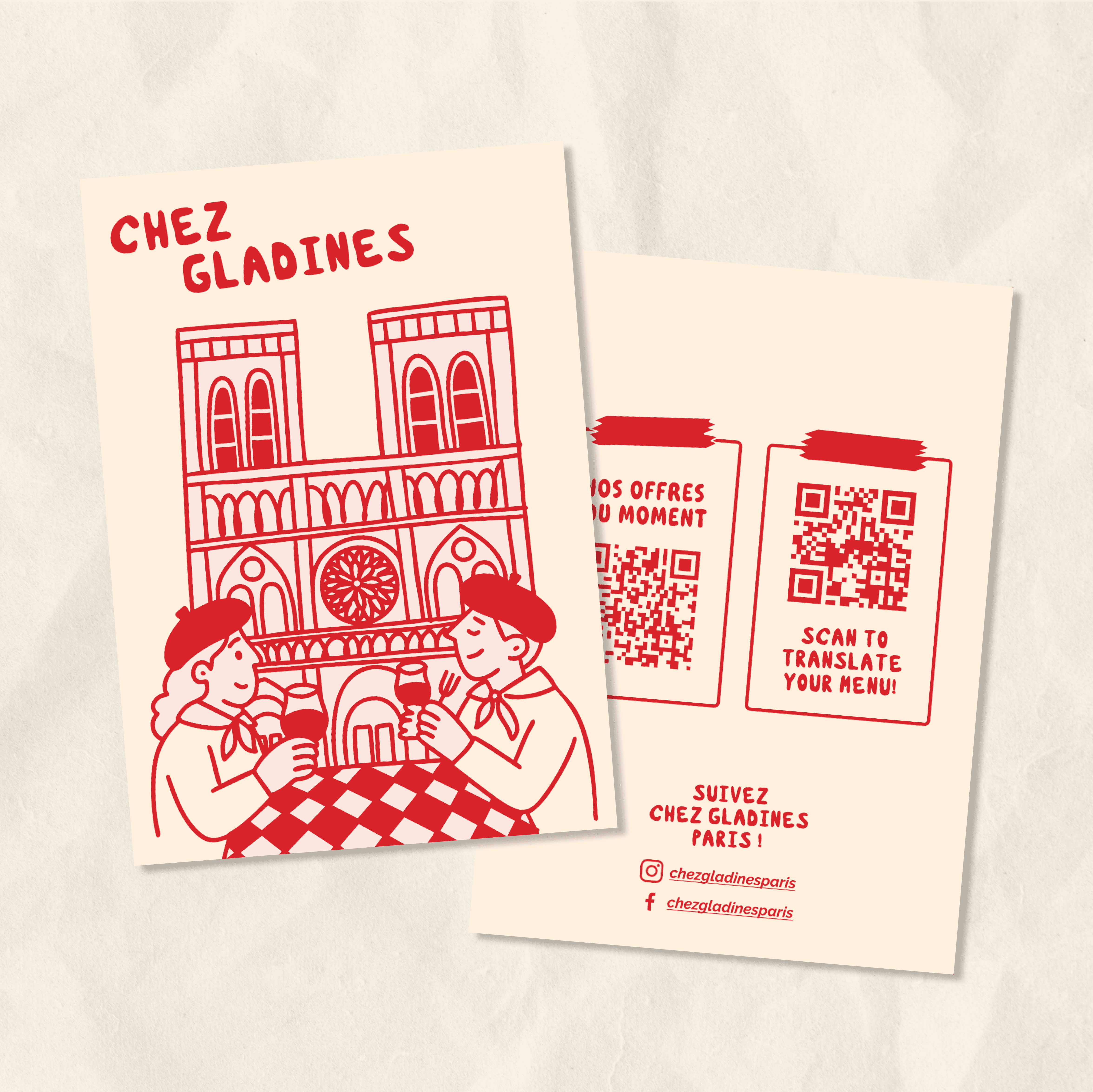 J’accompagne l’établissement sur l’ensemble de ses supports de communication : menus, affiches, cartes postales, cartes de visite… À chaque besoin, je transforme leurs idées en visuels cohérents et fidèles à l’identité chaleureuse du restaurant.
